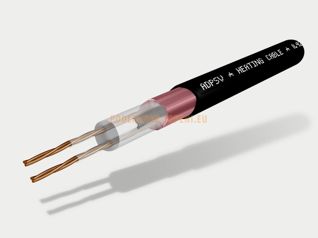 - Dvoužilový topný kabel ADPSV s výkonem 18W/m pro nezateplené stavby určené do poloakumulačních a akumulačních betonových podlah, nebo instalací ve venkovním prostředí s UV odolným PVC pláštěm