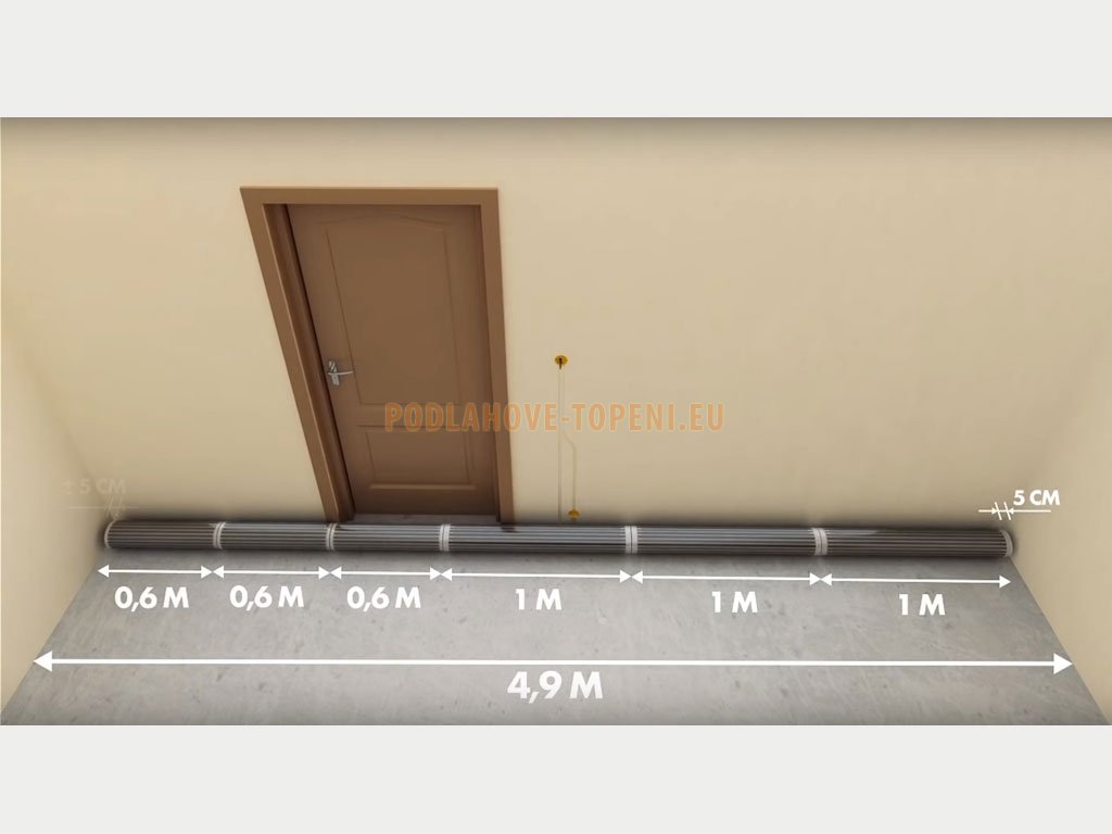 - Pás topné folie se zaizolovanými okraji s připojenými napájecími vodiči délky 5m