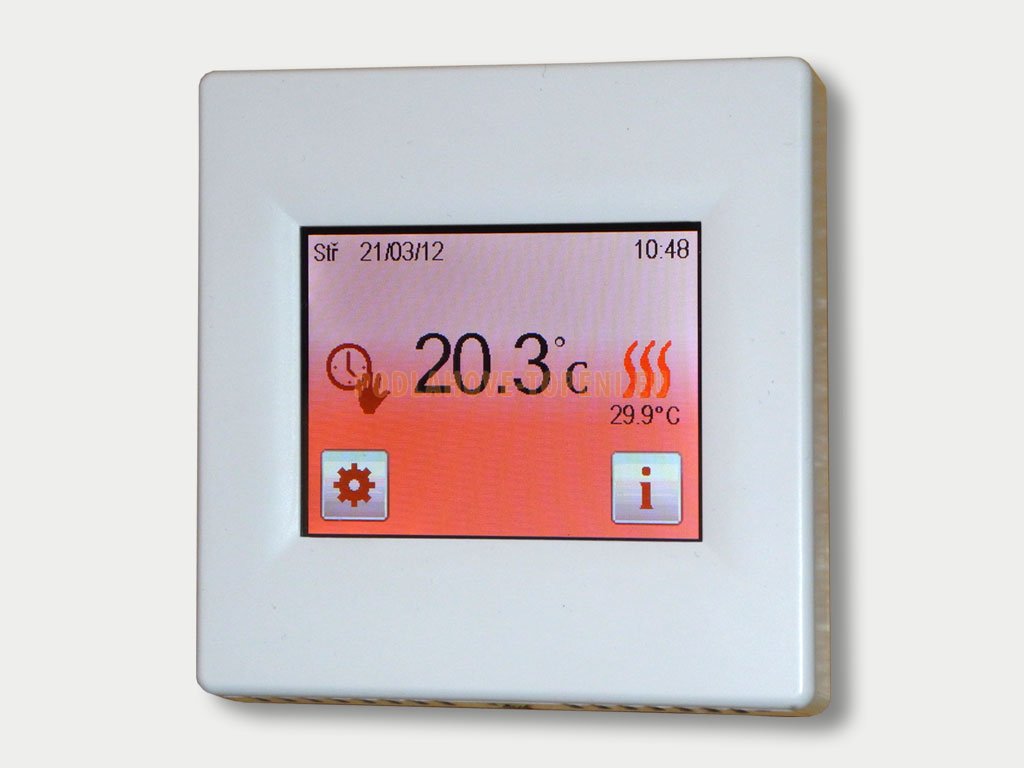 Barevný dotykový displej 2,8“, volitelná barva pozadí, CZ menu. Uživatelsky volitelné snímaní teplot - jen prostoru, podlahy, nebo obou hodnot, PWM regulace nebo pevná teplotní diference.
